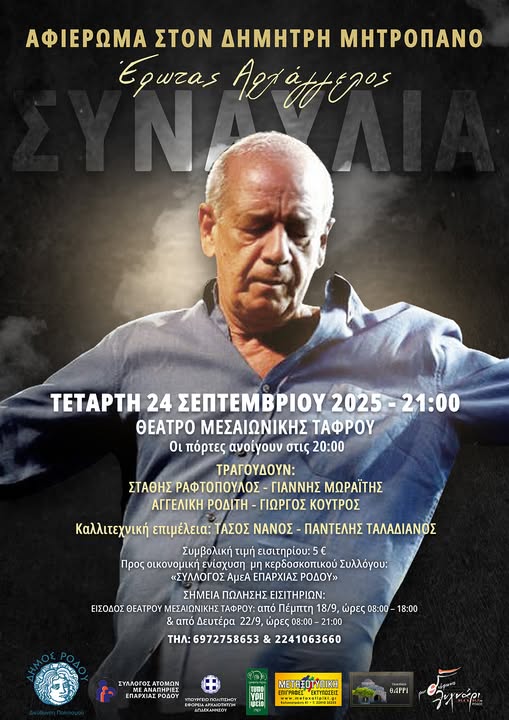 Η Διεύθυνση Πολιτισμού του Δήμου Ρόδου καλεί τους δημότες και επισκέπτες του νησιού να συμμετάσχουν στη συναυλία – αφιέρωμα και να τιμήσουν με την παρουσία τους το έργο και τη μνήμη του Δημήτρη Μητροπάνου, στηρίζοντας παράλληλα τον Σύλλογο ΑμεΑ Επαρχίας Ρόδου.